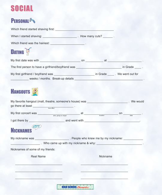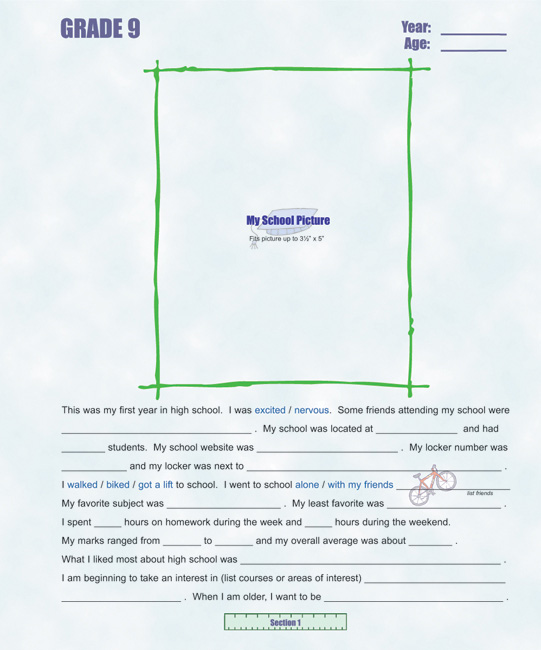 High School Chronicles is a high school scrapbook that covers Grades 9 - 12 along with a section devoted to college/ university. This scrapbook resembles a teenager’s diary and its binder allows for the insertion of all kinds of memorabilia, like report cards, awards, certificates and pictures.